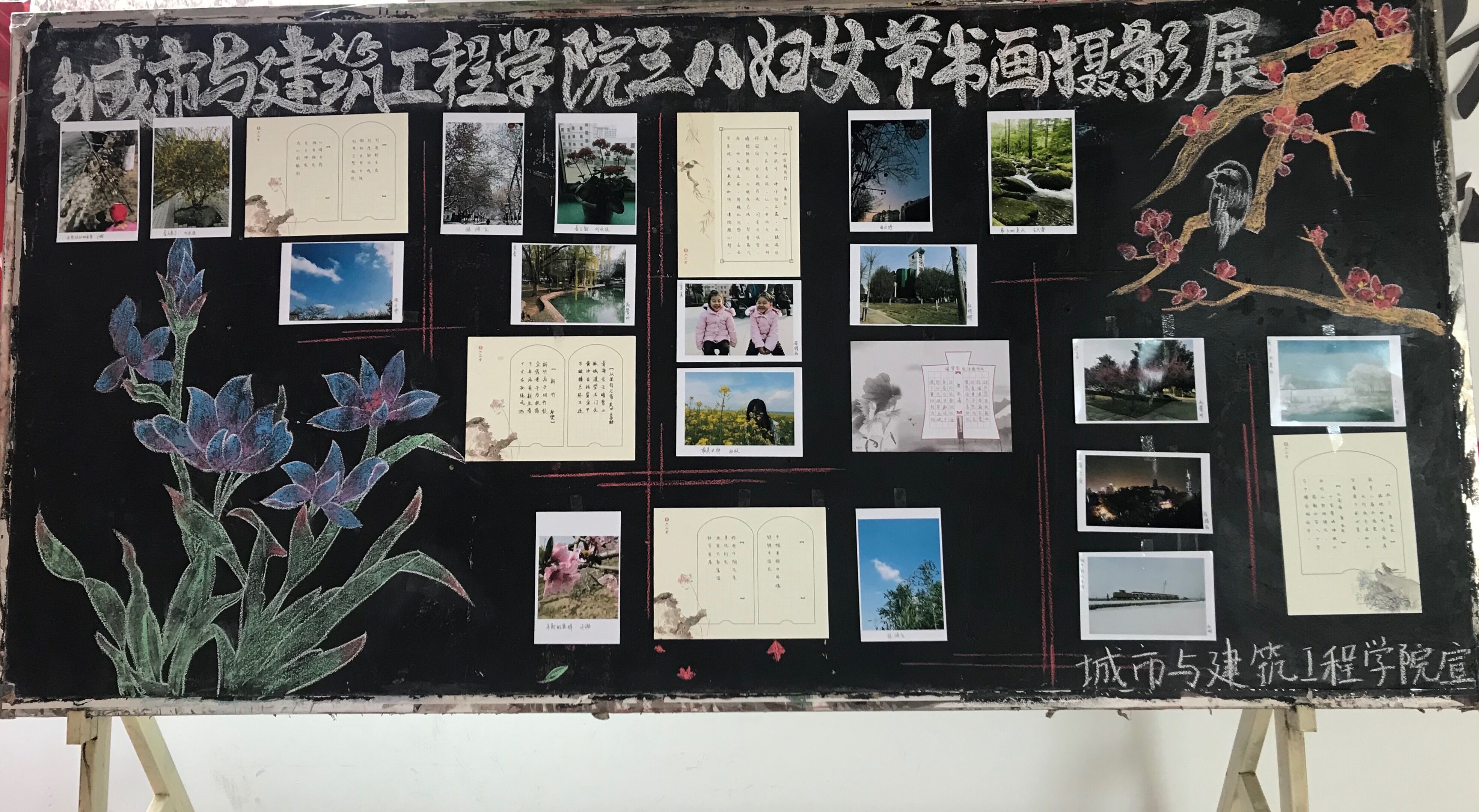 本次活动取得了比较令人满意的成果,总共上交作品二十余幅,主题鲜明,内涵丰富,包括书法作品和摄影作品,作品在理工楼三楼展出。作品融思想与艺术性于一体,展现了昂扬向上的精神风貌,展示了火热的生活和美好的春天精彩瞬间。