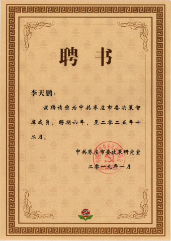 近日,城建公司李天鹏博士被中共枣庄市委政策研究室聘请为中共枣庄市委决策智库成员,聘期为2019.01-2025.12。受聘后,李天鹏博士将充分发挥自身专业背景和技术优势,主动当好政府部门的参谋和助手。 枣庄市委决策智库成员受委托就我市创新转型持续发展重大政策和重点项目建设等事项提出对策、意见和建议;应邀开展调查研究、专题研讨、专题讲座、决策咨询等活动,为市委决策提供科学依据;按照本人专业所长,结合枣庄实际,开展调查研究,为全市经济社会发展建言献策等。