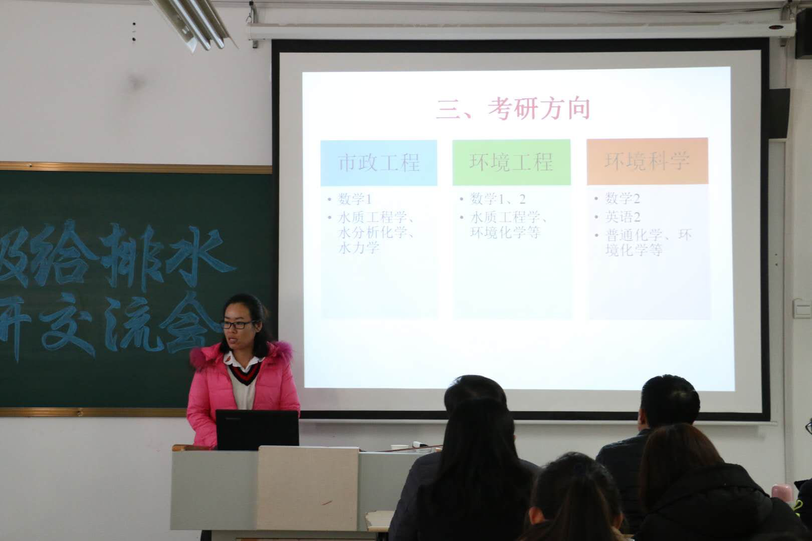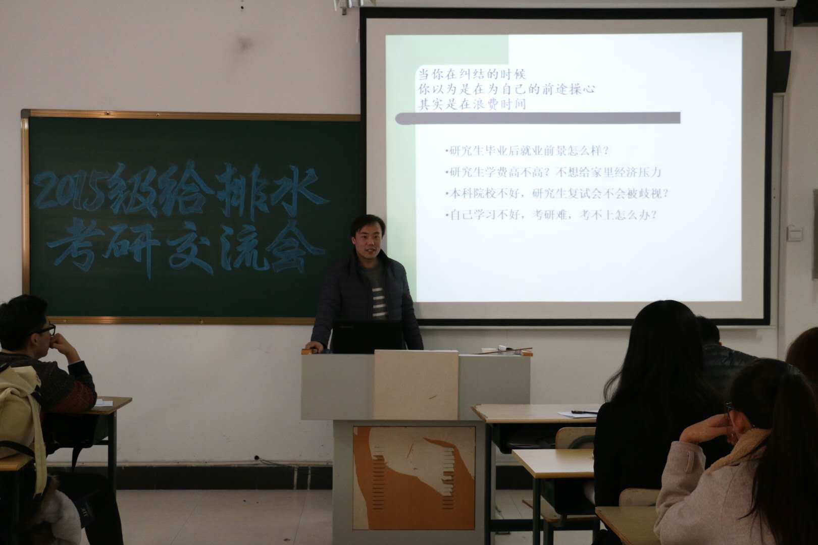 根据公司工作安排,城建公司于12月19日下午2:00,在理工楼301教室举办了2015级给排水专业考研交流会,给排水教研室全体专任教师、2015级给排水专业员工以及部分低年级同学参加了本次交流会。