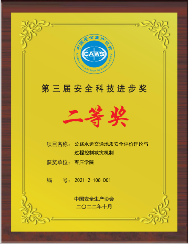 2023年10月10日,中国安全生产协会第三届安全科技进步奖颁奖仪式在成都举行,公司蓝鲸体育陈洪凯教授团队主持的《公路水运交通地质安全评价理论与过程控制减灾机制》成果荣获中国安全生产协会第三届安全科技进步奖二等奖。