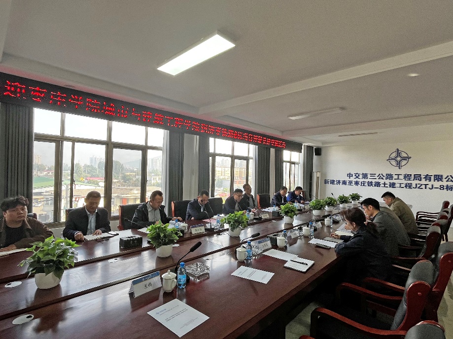 为进一步加强校企合作,促进产学研深度融合,2024年10月25日,城市与建筑工程公司党委书记查明、经理裘娜等一行5人,前往中交第三公路工程局有限公司济枣高铁8标段项目部进行调研交流。中交三公局交通轨道公司副总经理朱大勇、济枣高铁8标段项目部党支部书记李建飞、总工程师王德振等热情接待并进行座谈交流。交流活动由李建飞主持。