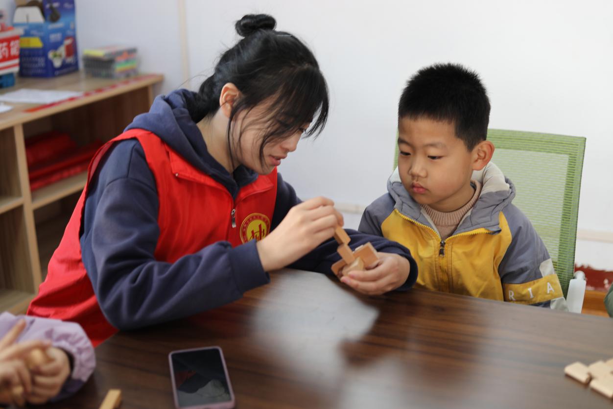 绘画结束后,志愿者们将鲁班锁与雷锋精神相结合,讲解并指导孩子们拆解、组装鲁班锁,教导孩子们学习雷锋不怕困难、勇于探索的精神。