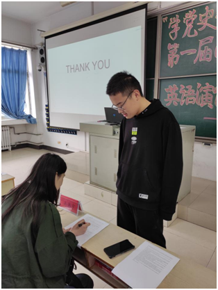 参赛选手围绕“党史为伴 阅享人生”进行英语演讲。结合个人成长经历,谈及了建党一百周年以及建党伟人对个人的影响及心得体会,言之有情,言之有理。演讲结束后,校学习部部长高伟宇对选手进行了点评,针对选手的发音及语法问题进行了讲解。