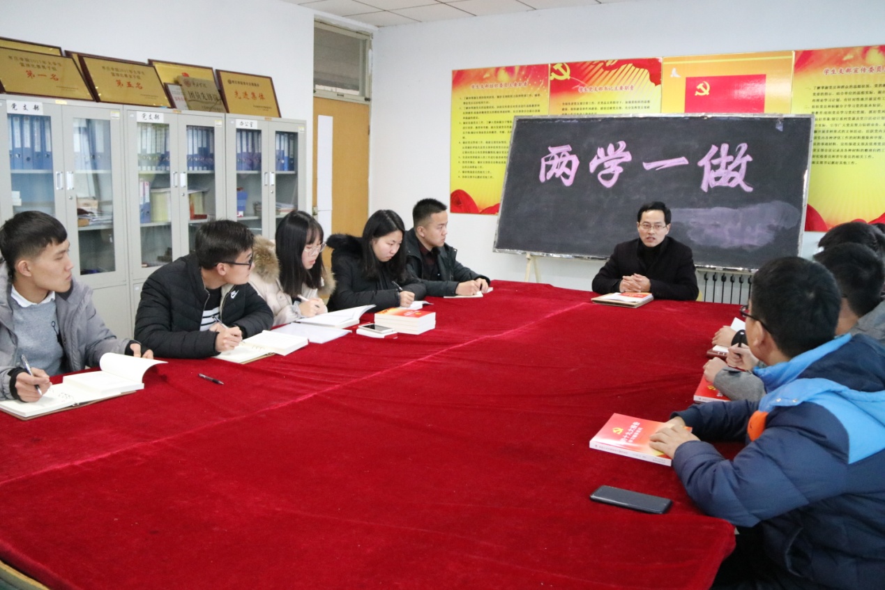 会议伊始,全体学习了《党的十九大报告学习辅导百问》一书中的“如何深刻体会习近平新时代中国特色社会主义思想是全党全国人民为实现中华民族伟大复兴而奋斗的行动指南”这一问题,会上党员认真听讲,及时记录,积极提问并发表了自己的见解。党员纷纷表示:一定起好先锋带头作用,做好模范作用,提高党性意识。会议期间,胡老师提出了近期党支部的工作重心,希望党支部的同学能够继续努力做好自己的本职工作,不要辜负党组织的期望;临近期末,希望全体同学加强复习,以认真负责的态度对待期末考试;同时做好班级的各项安全管理工作。